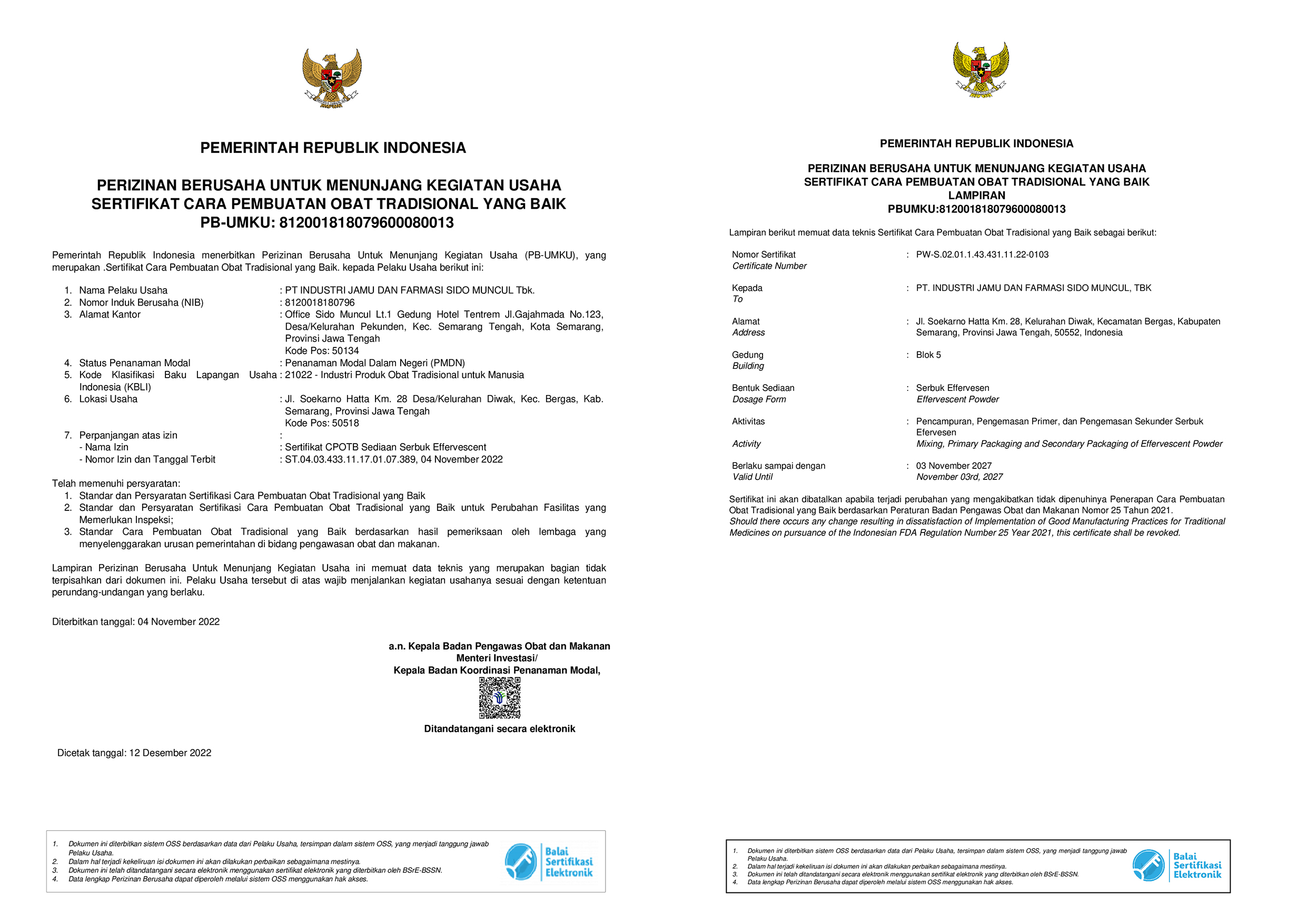 PT Industri Jamu Dan Farmasi Sido Muncul Tbk. was established in 1940 and is engaged in the manufacture of pharmaceuticals, traditional medicine, food, beverage, health, and cosmetic products. In our processes, we have adopted the following management standards: