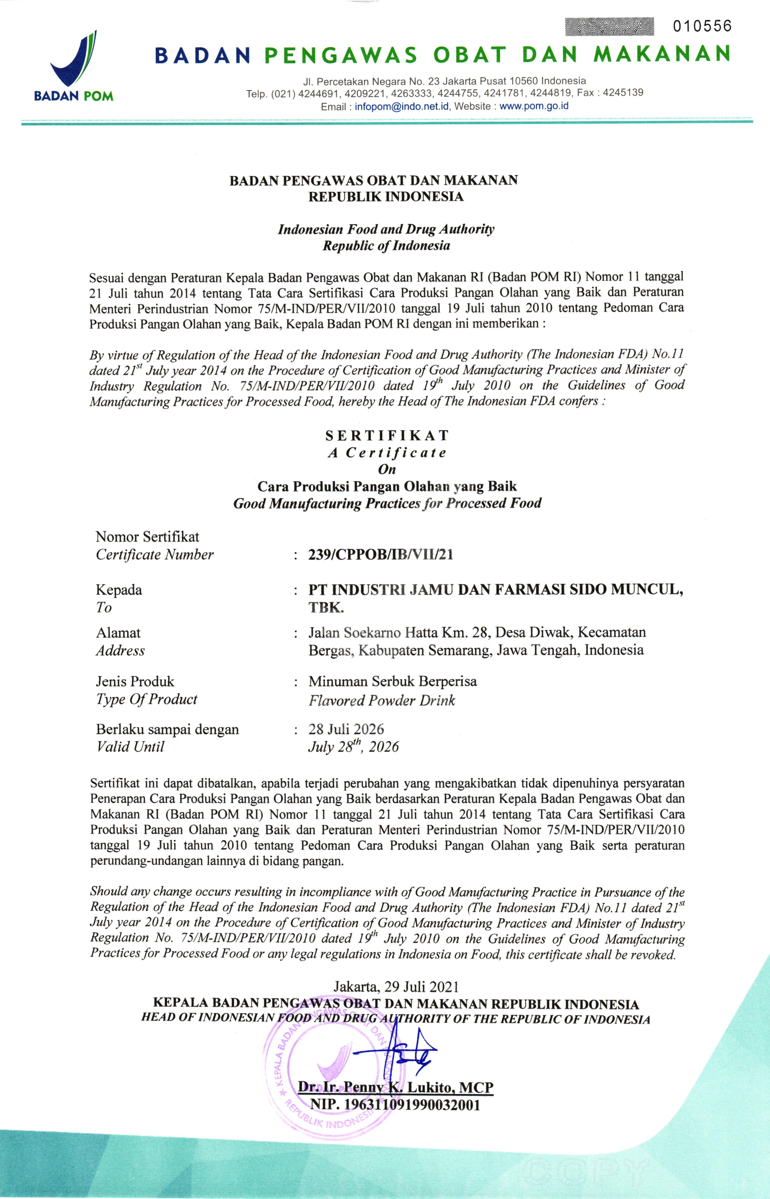 The CPPOB is a set of guidelines to produce good processed food products issued by the Ministry of Industry of the Republic of Indonesia. The certification is issued by the BPOM. We received the CPPOB certification in 2021.